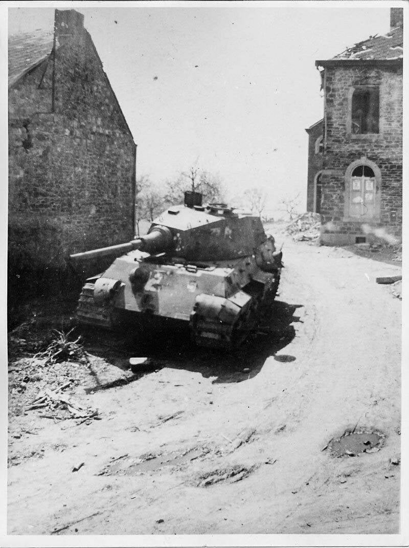 During the advance many Königstiger came in contact with the enemy – several of them being able to destroy multiple American tanks. Some Königstiger fought fiercely and only got disabled when attacked from multiple sides and in many cases from different types of US hardware: M10 tanks, M4 Shermans, 90mm Anti Air guns in ground mode, artillery, by air (fighter) bombers, mines or bazooka’s – and even captured Panzerfausts. Many Königstiger got stuck in ditches, buildings/ walls; lost their tracks or had all kinds of mechanical breakdowns. Most panzer crews tried to disable their own Königstiger when evacuating – not all succeeded in this.