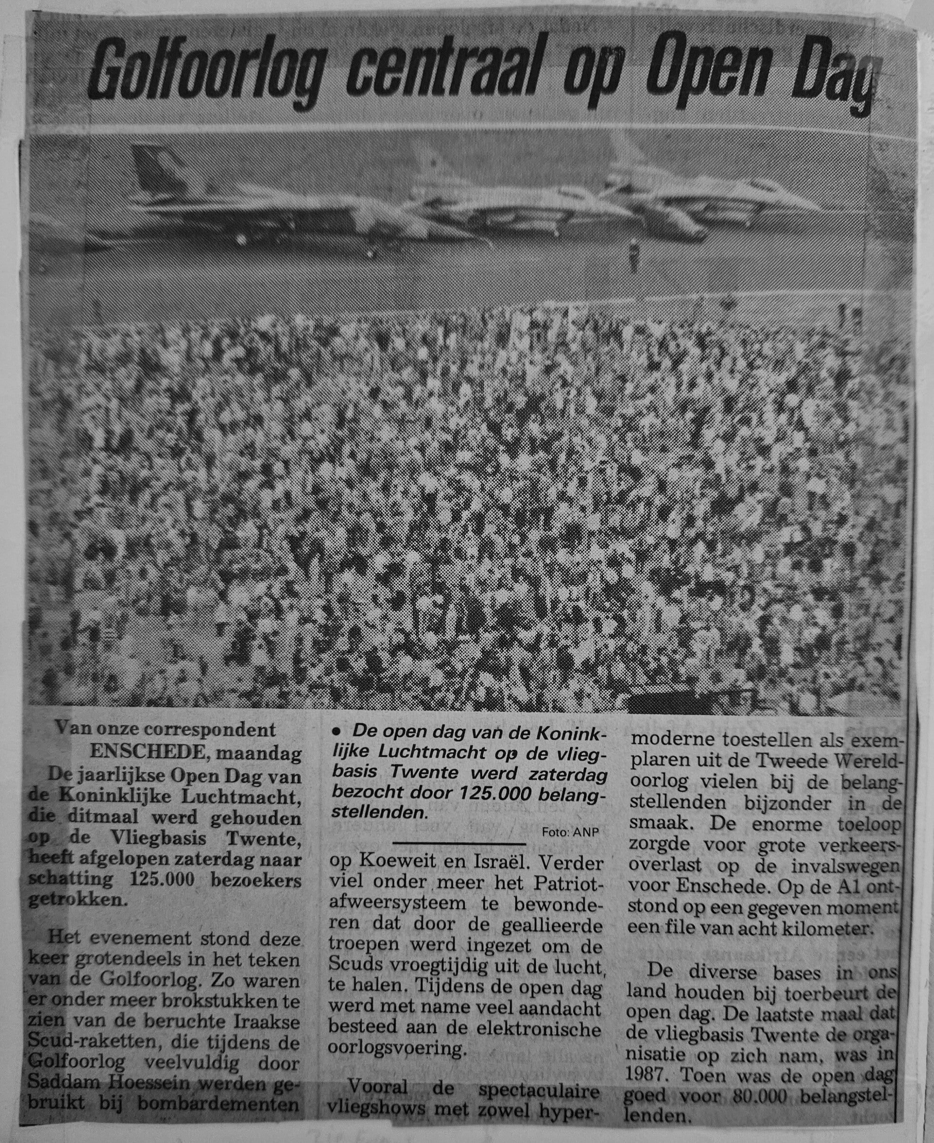 The Twenthe 1991 air show was right after the 'glorious' siege of the first gulf war. Many attending British aircraft were still in desert c/s. The participating British Tornado demo made a near mach low level pass; making baby's and small children crying! The US Upper Heyford F-111E performed a burning fuel dump pass warming the crowd. Also a full color US KC10A attended the static show as prequel to the sale of this type to the Dutch air force.