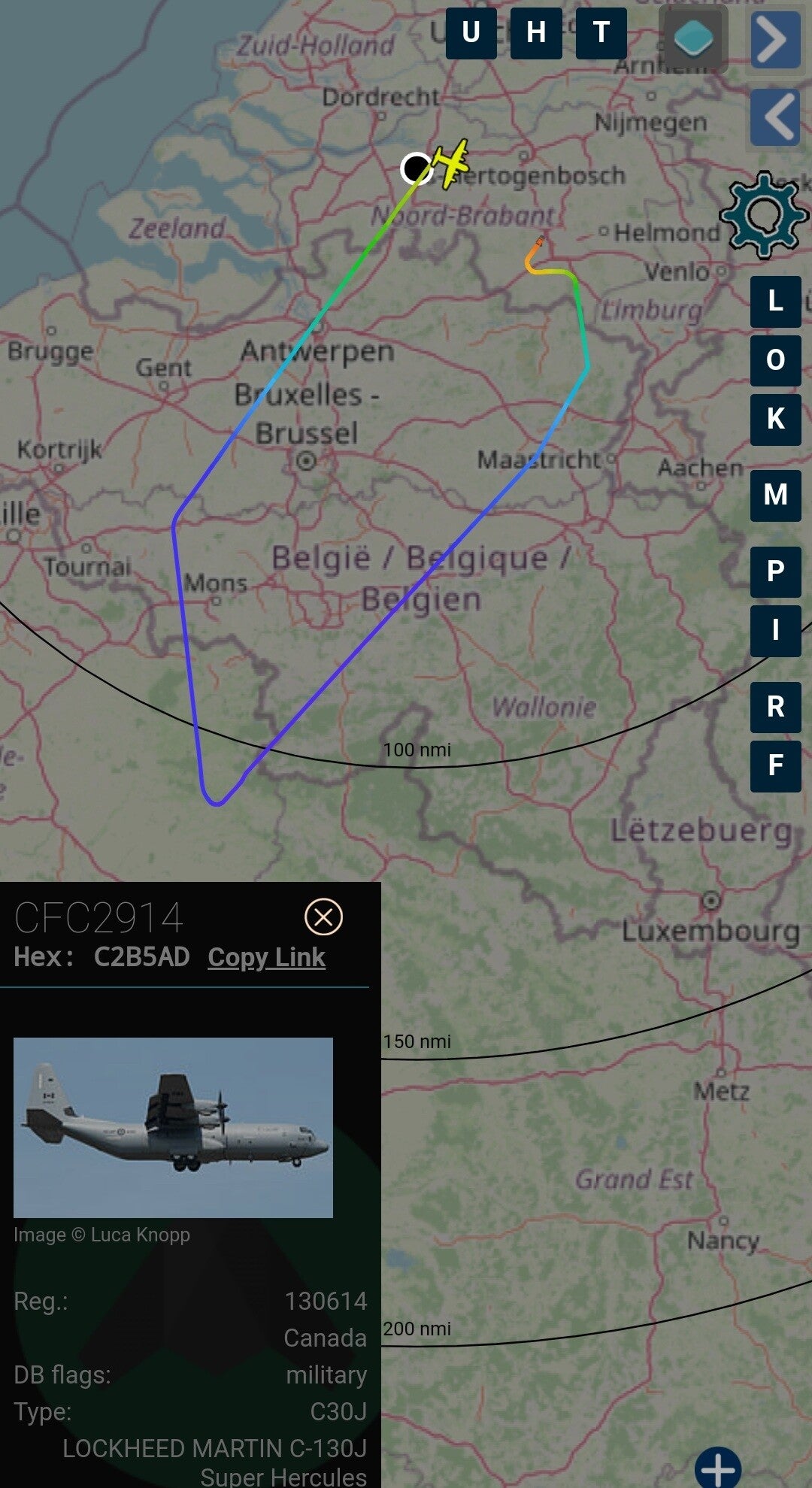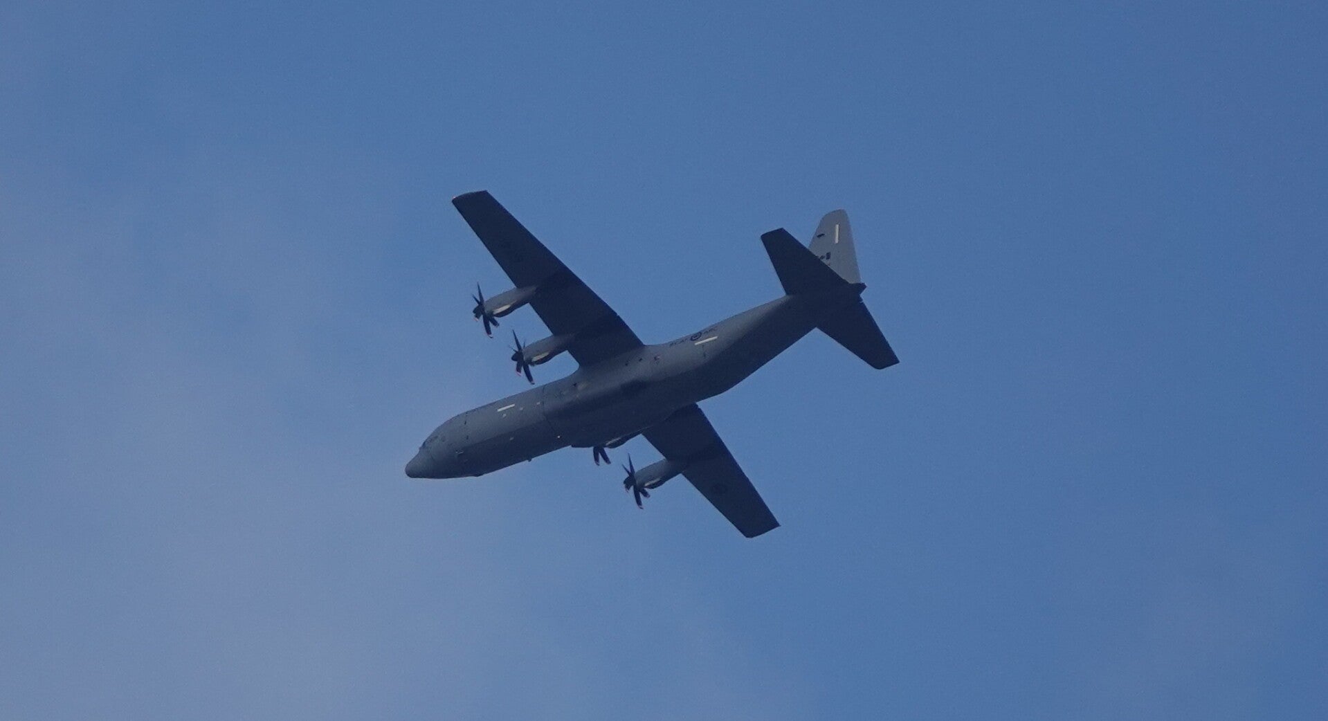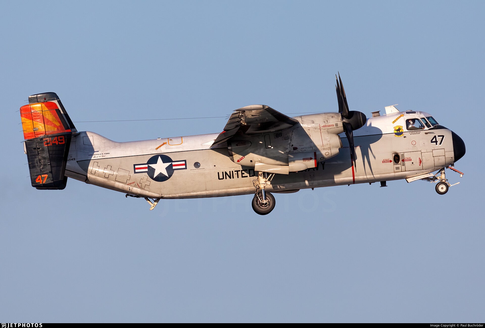 Very rare aircraft types crossing Woensdrecht airbase at medium altitude were a pair of aircraft carrier based C2A Greyhounds! During the July 2023 period the USS Gerald R. Ford was stationed in the North Sea and surrounding area's suporting the large scale Air Defender 2023 exercise. Both Greyhounds were regularly flying with RG1 and RG2 callsigns between their carrier and many shore based stations. the photograph above on the right is just for reference only and is published on Jetphotos.net by Paul Buchroder. On the two left photographs taken with 600mm are the full color roundels visible as wel as the carrier wire arresting hook and black tails with red/ yellow tops.