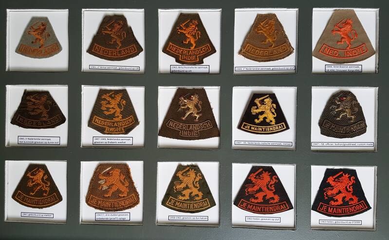 Collection of so called 'mouwleeuwen' (uniform sleeve lions). These are worn by all Dutch (army) soldiers since 1941. In my collection is the very first model as well as several Dutch East-Indies models, gold thread embroidered officer uniform models all the way to the current type.