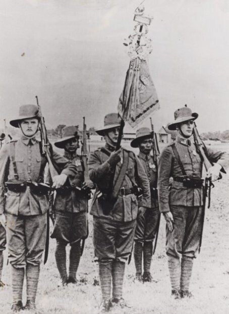 In the latest photographs of Theo before the Japanese invasion he wears 'flaming grenade' insignia's on collar and shoulder. These indicate service with the heavy weapons company of the Battalion. This company had a total of 12 6,5mm machine guns (Schwarzlose M08), a section of 3 anti-tank 20mm rifles and a platoon of 6 80mm mortars. As a Sergeant he would have commanded a section of his own.