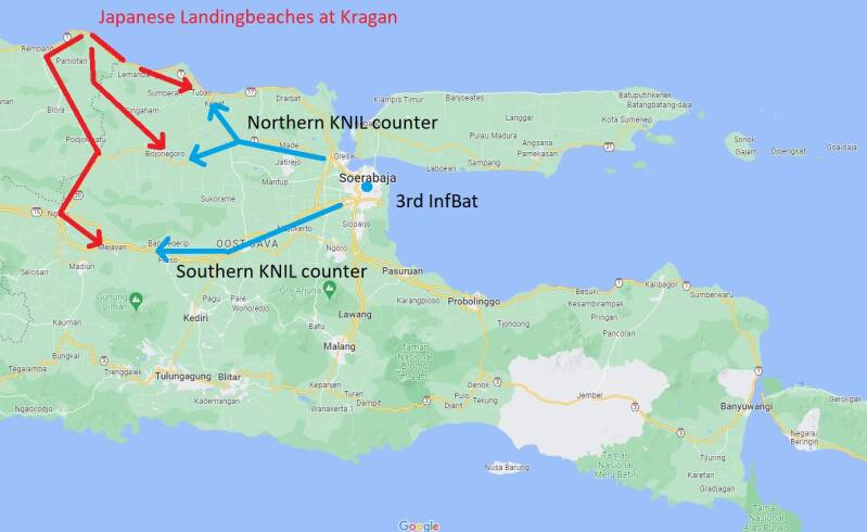On the first of March the Japanese landed at Kragan - 134km West of Surabaya. Large Japanese troop concentrations started moving to the South and East. KNIL units were counterattacking (by a Northern and Southern axis) but these were futile attempts. The Japanese had superior combat proven units in larger quantities with back up of tanks and aircraft. Besides this the Japanese would pincer move against Surabaya if they could not be stopped.