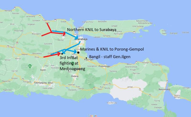 On the 6th of March the destruction of Surabaya was complete. The staff retreated to Bangil in the South-East. KNIL forces were continuously fighting in the South and North and had no chance to disengage. Units West of Surabaya, including an American US Army artillery unit, had to retreat to Surabaya itself. Dutch Marines were heavy engaged in the South-West together with other KNIL units.