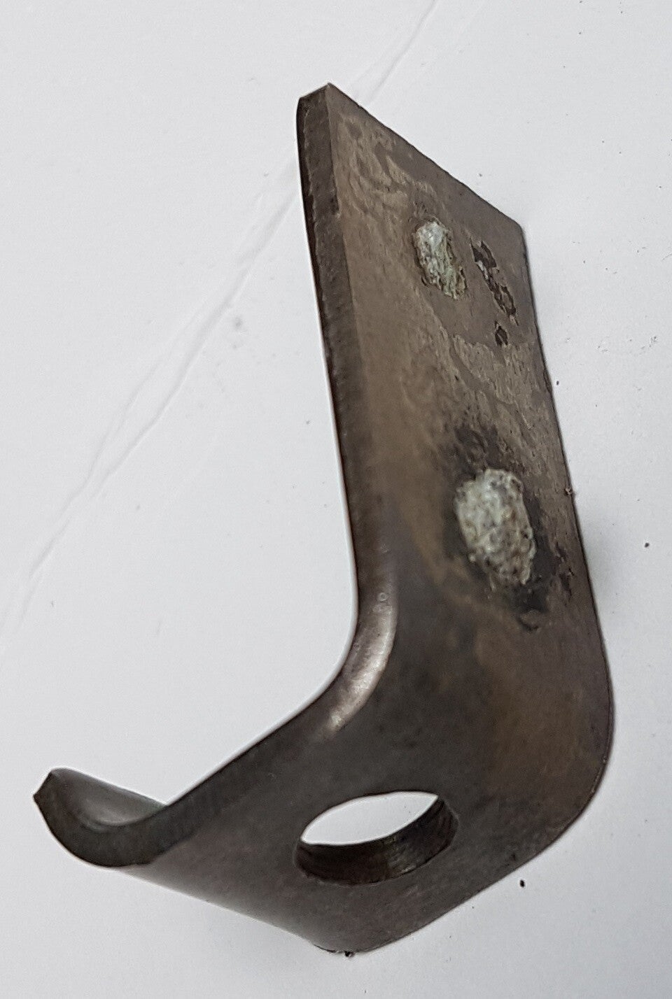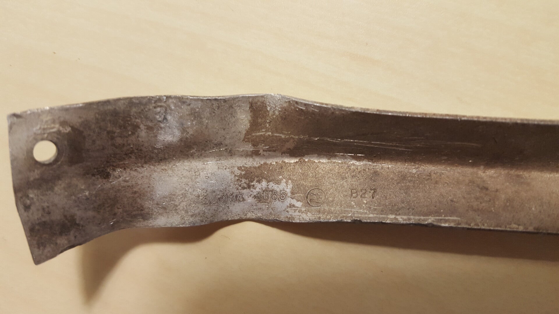 Three photographs of another high quality piece of metal; has quite some mass, no corrosion (only superficial rust) and impossible to bend. One side is U-shaped and has 2 rows of 3 (attachment) holes, the other side has two large points were it seemed to be attached to some structure.