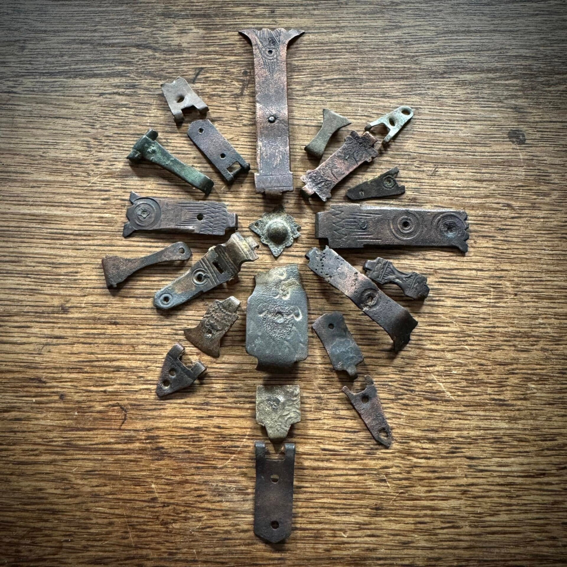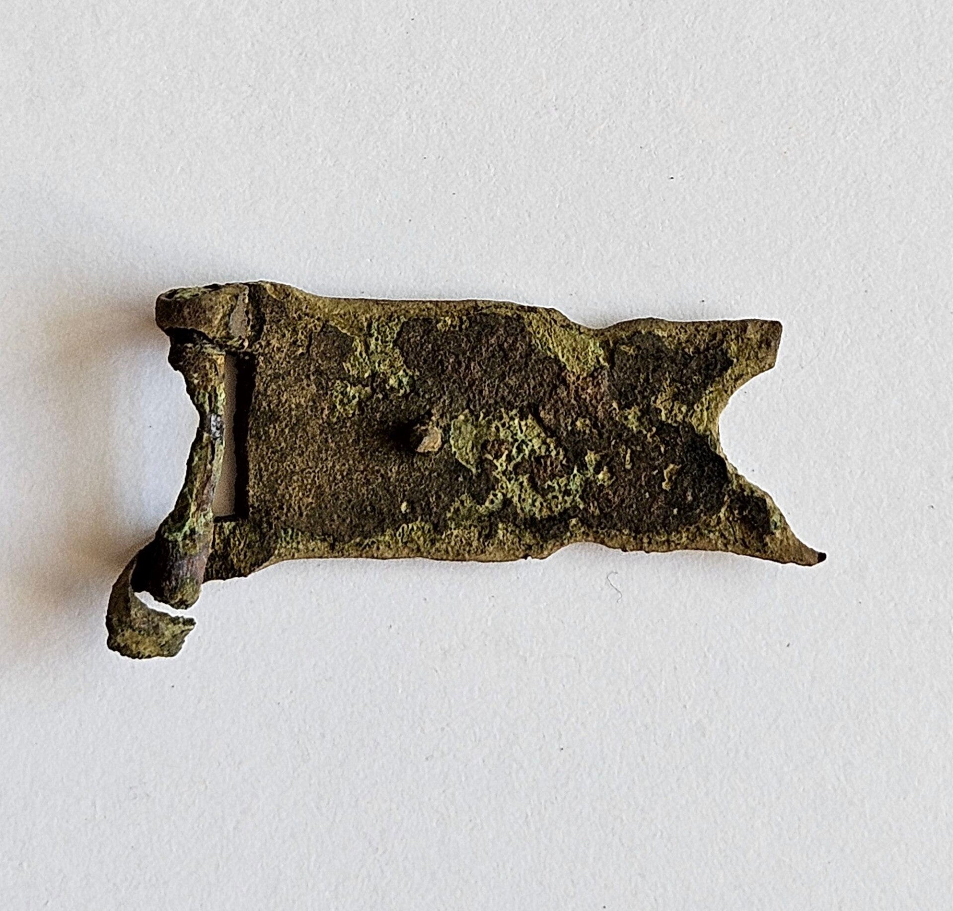 Maybe a strange location for putting book clasps as a sub-chapter of Leather Belt plating&decorations - truth is many worn items are most likely book clasps. Some are damaged and could have been items such as Other Clothing items....or even parts of Buckles. Nevertheless some are definitely book clasps! Ancient books held leather and or wooden covers. These books held mostly heavy weight and many pages, resulting in a thick book. These books were held together and closed by metal clasps. These clasps consisted of multiple pieces and different types of sets existed. Many parts can still be found.