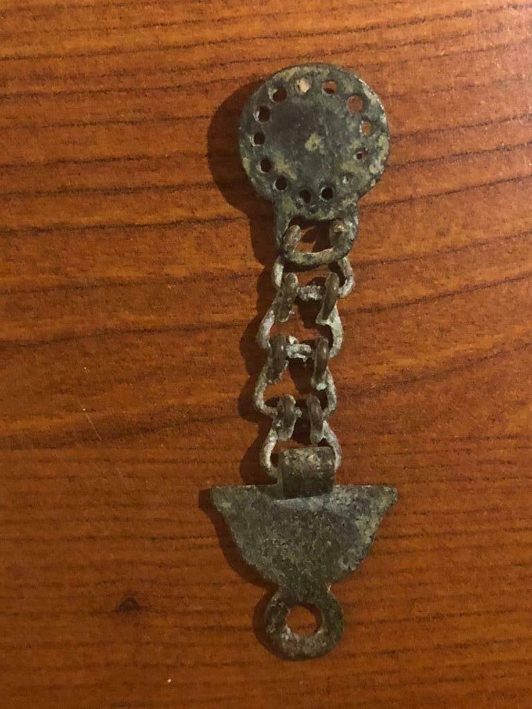 Small clasp used in hanging mechanisms for old oil lamps.