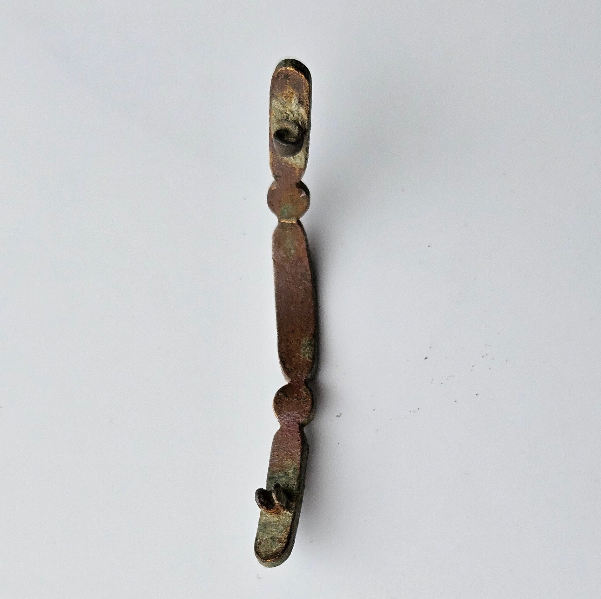 A more modern (19th/ 20th century) hairpin; the pin on the backside is missing. The front side was decorated with black paint, some still visible.