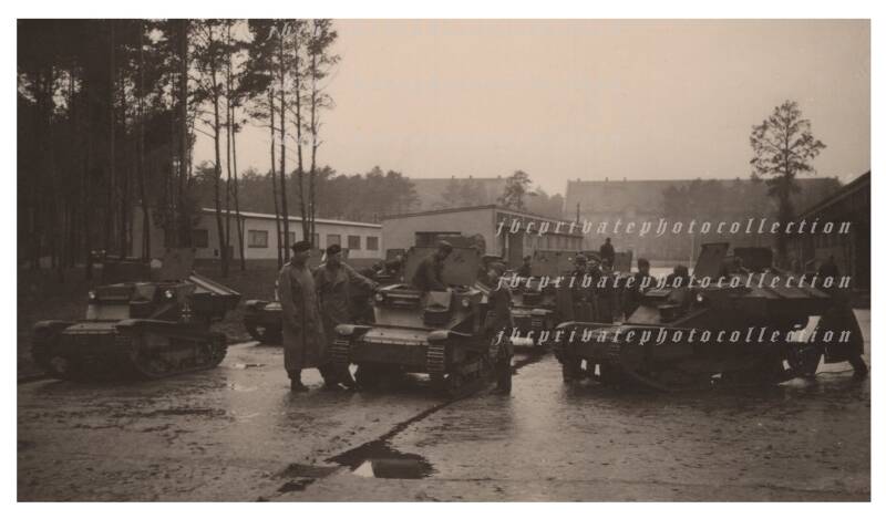 It looks like there are 2 rows of 4 muntionspanzers and 1 separate munitionspanzer parked on this photograph – although one munitionspanzer is not visible. This would mean ALL 9 modified munitionspanzers are visible on this photograph. There are only 3 pictures (including this one) known of this model. Making this a very rare and valuable photograph. German cross on the most left munitionspanzer is clearly visible.