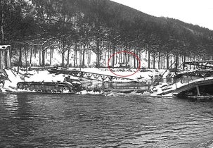 Near Stavelot a small bridge crosses the Ambleve river. Since the Germans were quite short of bridges a Jagdpanzer IV tried to cross it from the South in vain. The bridge could not hold the weight and it collapsed. Photograph above right view from the West: the Jagdpanzer can be seen to the left and in the background a Königstiger, no 133, which broke down. Close up of the Jagdpanzer IV to the left above and Königstiger 133 in the centre. Below the Petit Spay bridge seen from the South-West (same as the black and white photographs) with a map in the centre as reference of the area.